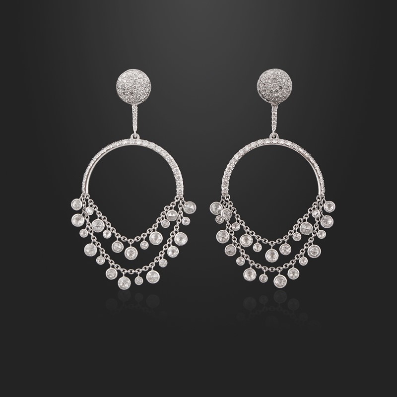 pendenti in oro bianco e brillanti, un bottone superiore sostiene un semicerchio da cui si dipartono catenelle con diamanti a rosa. Diamanti del peso complessivo di 7,70 ct ca., gr. 21,3. Numero di matricola: E 18051 Firmati: Piaget