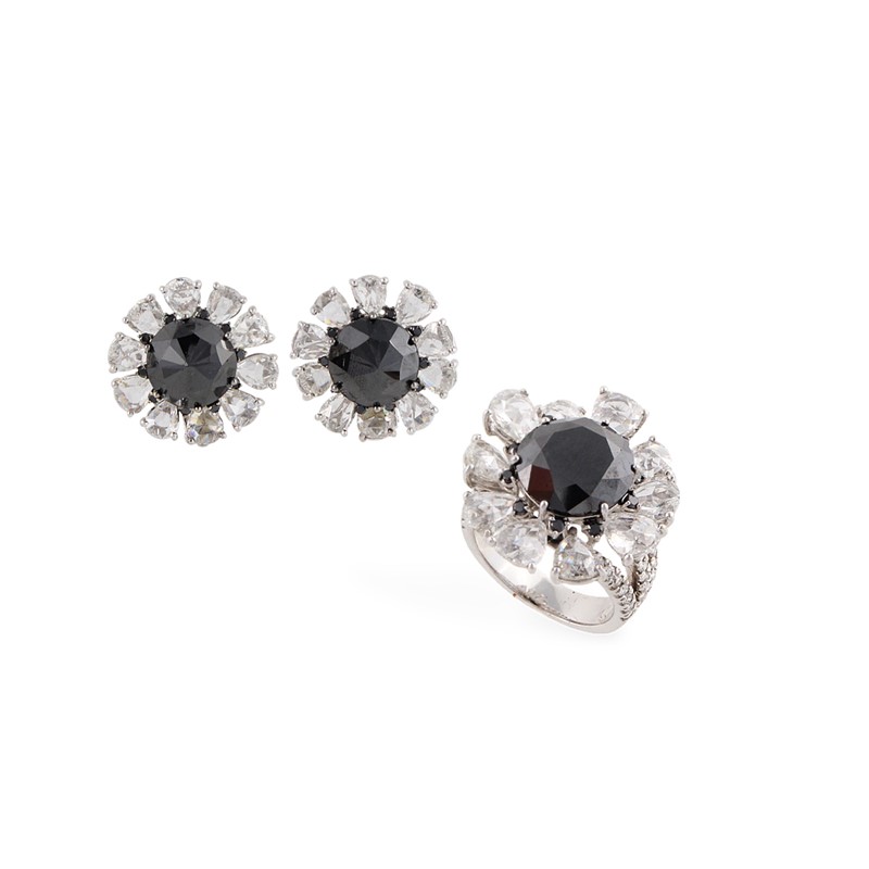 orecchini e anello in oro bianco con diamanti neri al centro taglio brillante e cabochon faccettato, diamanti a goccia taglio a rosa a contorno, gr. 32,7.