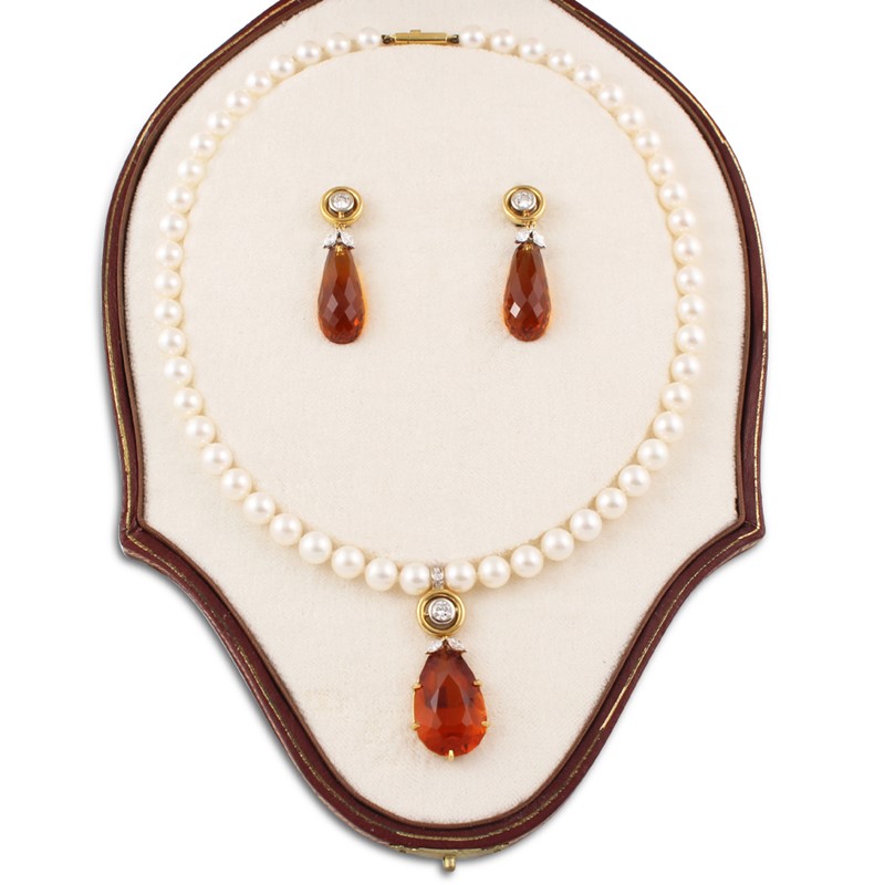 composta da collana a un filo di perle coltivate 7,00 mm con pendente in quarzo madera a goccia faccetta montato in oro giallo e bianco con brillanti. Orecchini pendenti in quarzo madera briolette, montati in oro giallo e bianco con brillanti. Brillanti del peso complessivo di 1,00 ct ca., gr. 47,1. Corredata da custodia. Lunghezza collana 39,5 cm