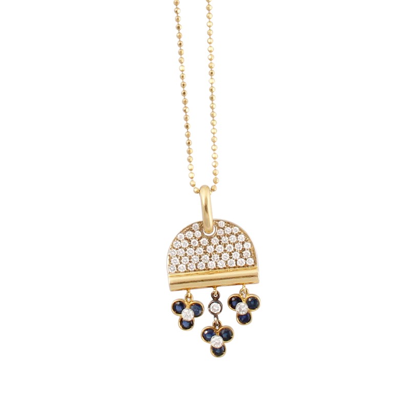 in oro bianco e giallo con zaffiri e brillanti del peso complessivo di 1,20 ct ca., catenina, gr. 12,6. Lunghezza collana 38 cm