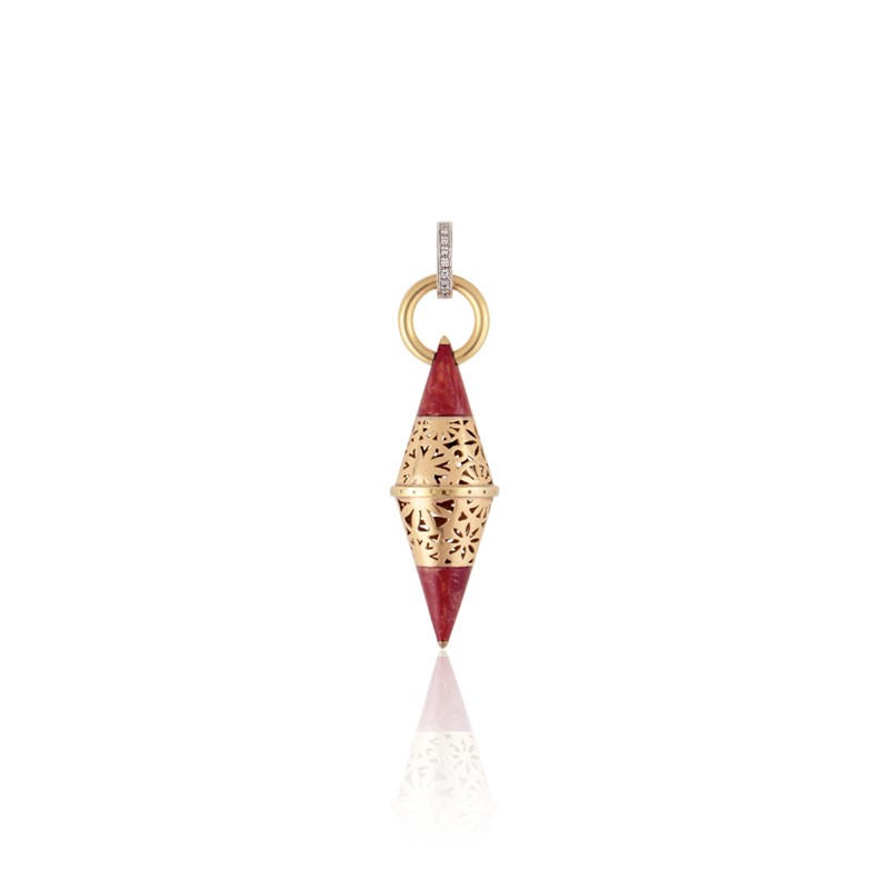 in oro giallo a coni sovrapposti traforati con smalto marrone e chiusura in oro bianco e brillanti, gr. 21,2.