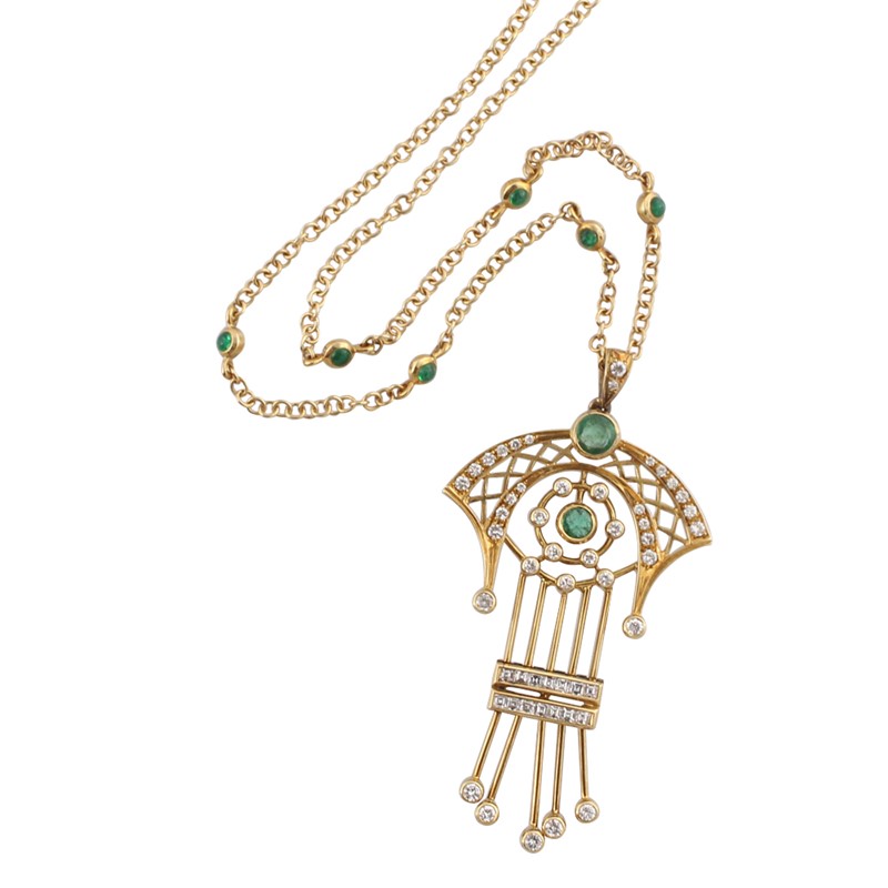 in oro giallo con catena a disegni geometrici con smeraldi e brillanti del peso complessivo di 1,00 ct ca., smeraldi cabochon, gr. 21,3. Lunghezza 38,5 cm