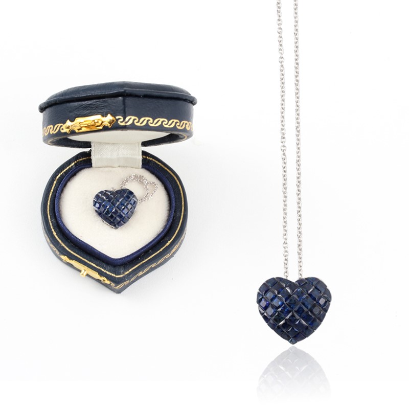 in oro bianco a forma di cuore con pavè di zaffiri carrè, incassatura invisibile, catenina, gr. 4,5. Corredato da custodia. Lunghezza 43,5 cm