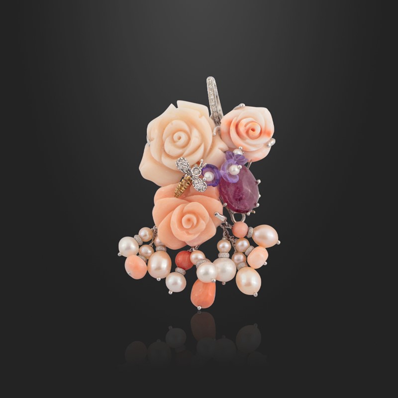 doppio uso, composizione in rose in corallo, perle, tormaline e diamanti, montati in oro bianco, gr. 40,3.