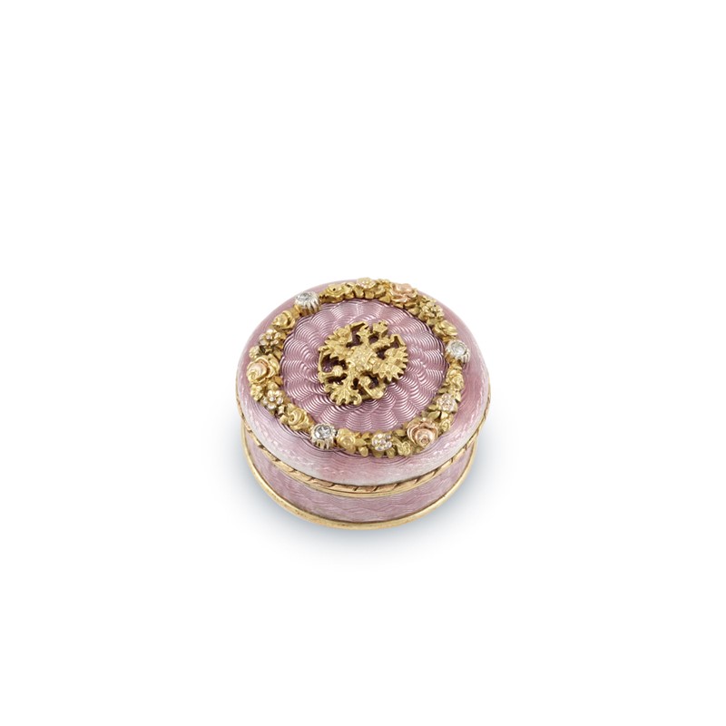 in oro giallo a 14Kt con smalti violacei, riporto di ghirlanda in oro giallo e argento, piccoli diamanti e aquila bicipite al centro (Russia), gr. 25,8.