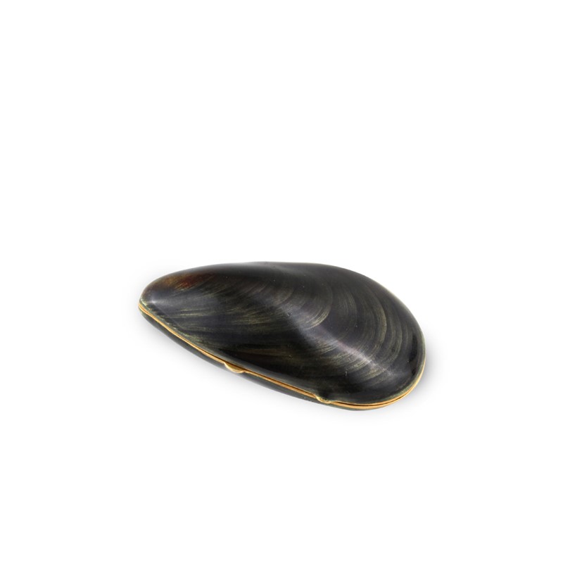 in oro giallo raffigurante una cozza, smalto nei toni del nero e del verde, gr. 29,8.