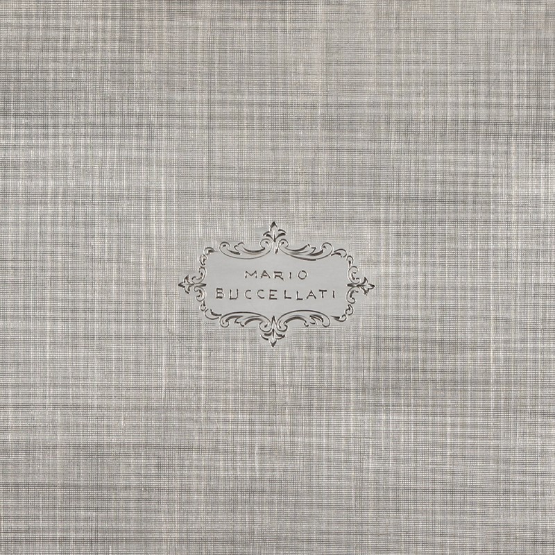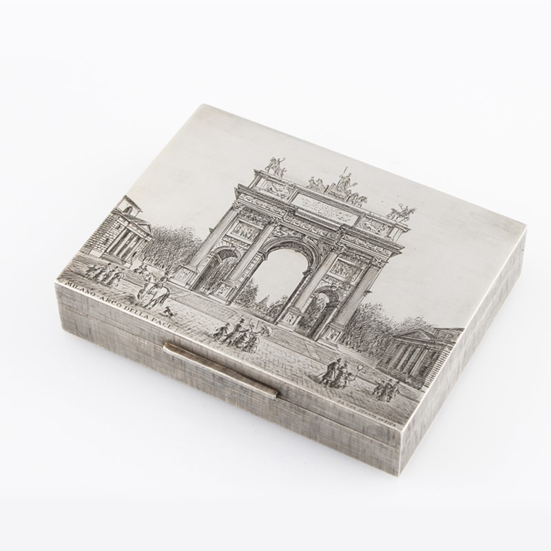 in argento 925, a forma rettangolare satinata con riprodotto sul coperchio “Arco della Pace”, finemente inciso, interno lucido con decorazioni, gr. 290,8. Numerario 15 MI Firmato: M. Buccellati