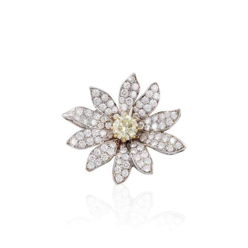 in oro bianco raffigurante una margherita con petali in pavé di brillanti del peso complessivo di 4,00 ct ca. Al centro un brillante giallo del peso di 1,88 ct entro “griffes” in oro giallo, gr. 12,4.