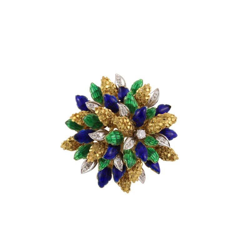 in oro giallo e bianco a forma floreale con smalti verdi e blu e piccoli diamanti, gr. 16,2.