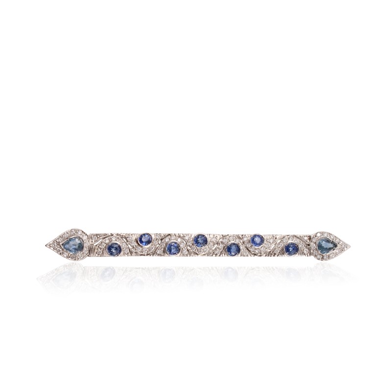 “barrette” in oro bianco a motivi ondulati con piccoli brillanti e zaffiri, gr. 8,9.