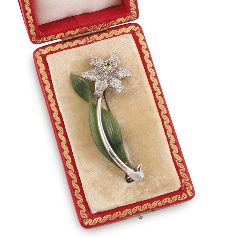 in oro bianco raffigurante un narciso con al centro un diamante “fancy” trattato, brillanti “brown” e incolore ad ornamento, nefrite incisa a forma di foglia, gr. 18,6. Corredata da custodia.
