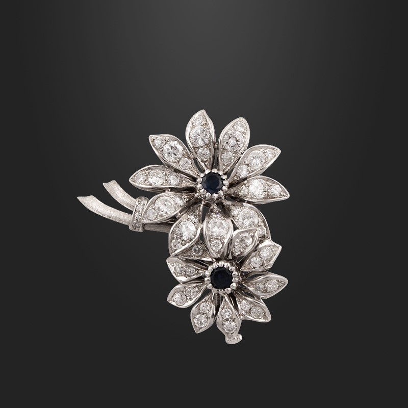 raffigurante due margherite in oro bianco con brillanti del peso complessivo di 2,10 ct ca., ciascuna con zaffiro tondo centrale, gr. 11,1.