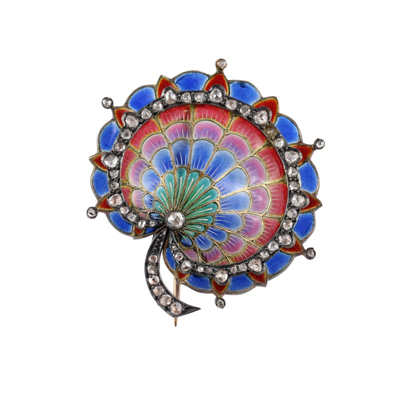in oro e argento, a forma floreale “plique a jour”, con diamanti a rosa, smalti policromi, gr. 16. Corredata da custodia. Fine XIX secolo