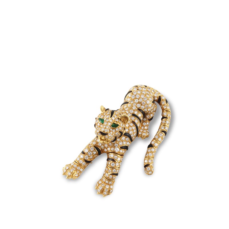 in oro giallo raffigurante una tigre, brillanti del peso complessivo di 8,50 ct ca., smeraldi per occhi, striature in onice, gr. 38,1.