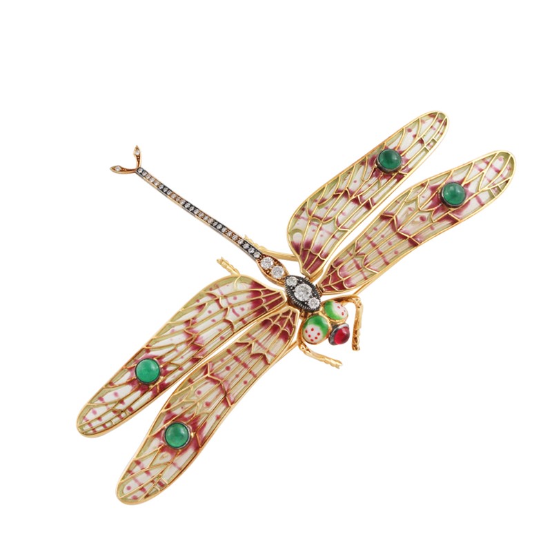 in oro giallo e argento a forma di libellula, smalto “plique a jour” con smeraldi, rubino cabochon e brillanti, gr. 29,3.