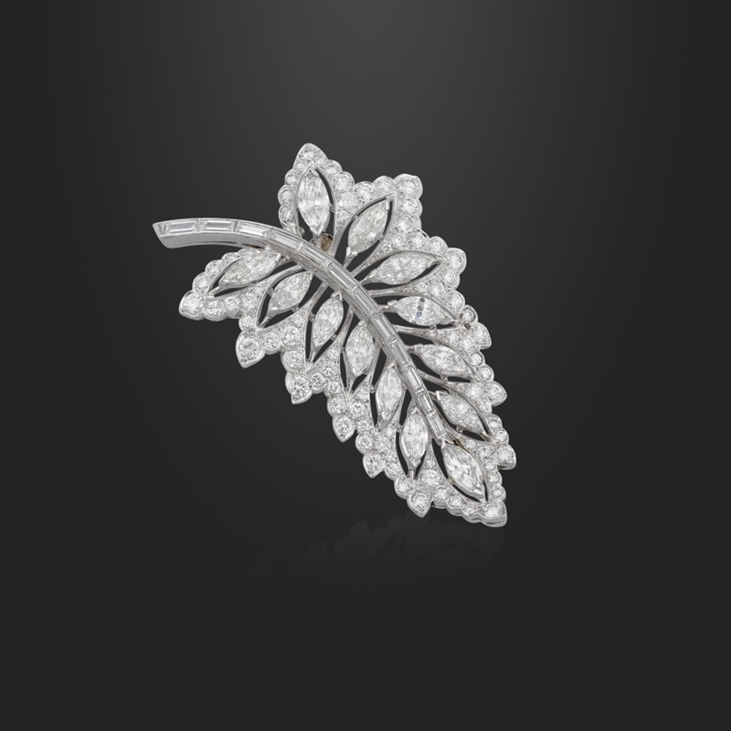 raffigurante una foglia interamente realizzata in platino, brillanti e diamanti navette con nervatura in diamanti baguettes. Diamanti del peso complessivo di 9,00 ct ca., gr. 21,7.
