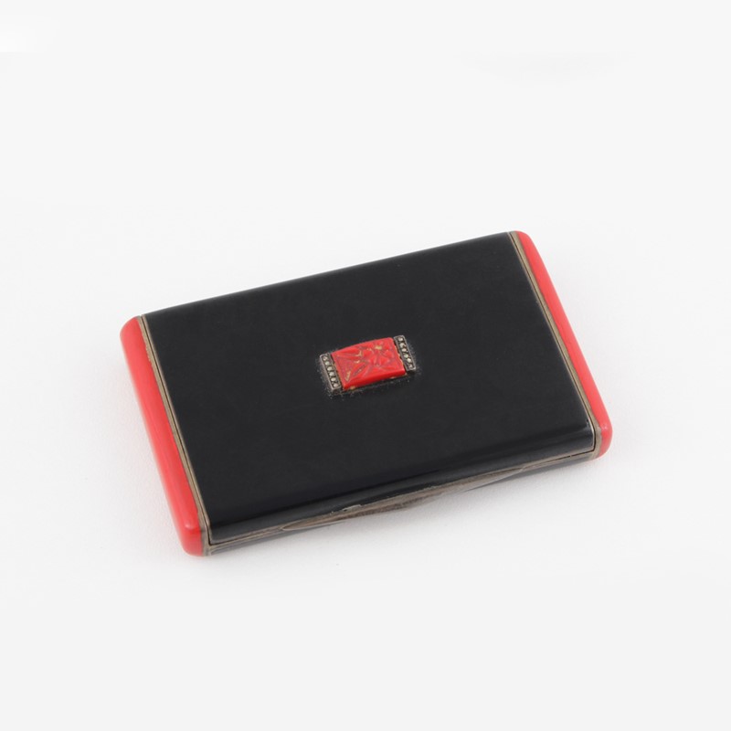 in argento con lacca nera e rossa (mancanze), interno dorato, gr. 76,3. Dimensioni 8x5x1 cm