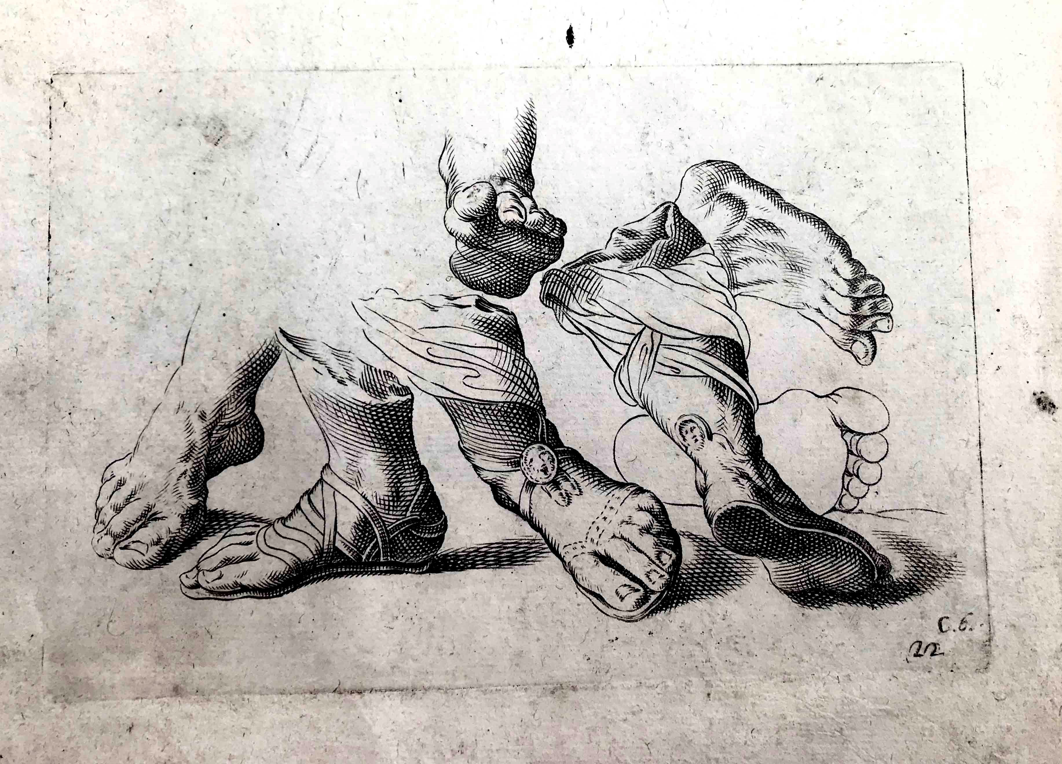 Autori del'600, 2 incisioni Cartiglio di invenzione e Studio di piedi