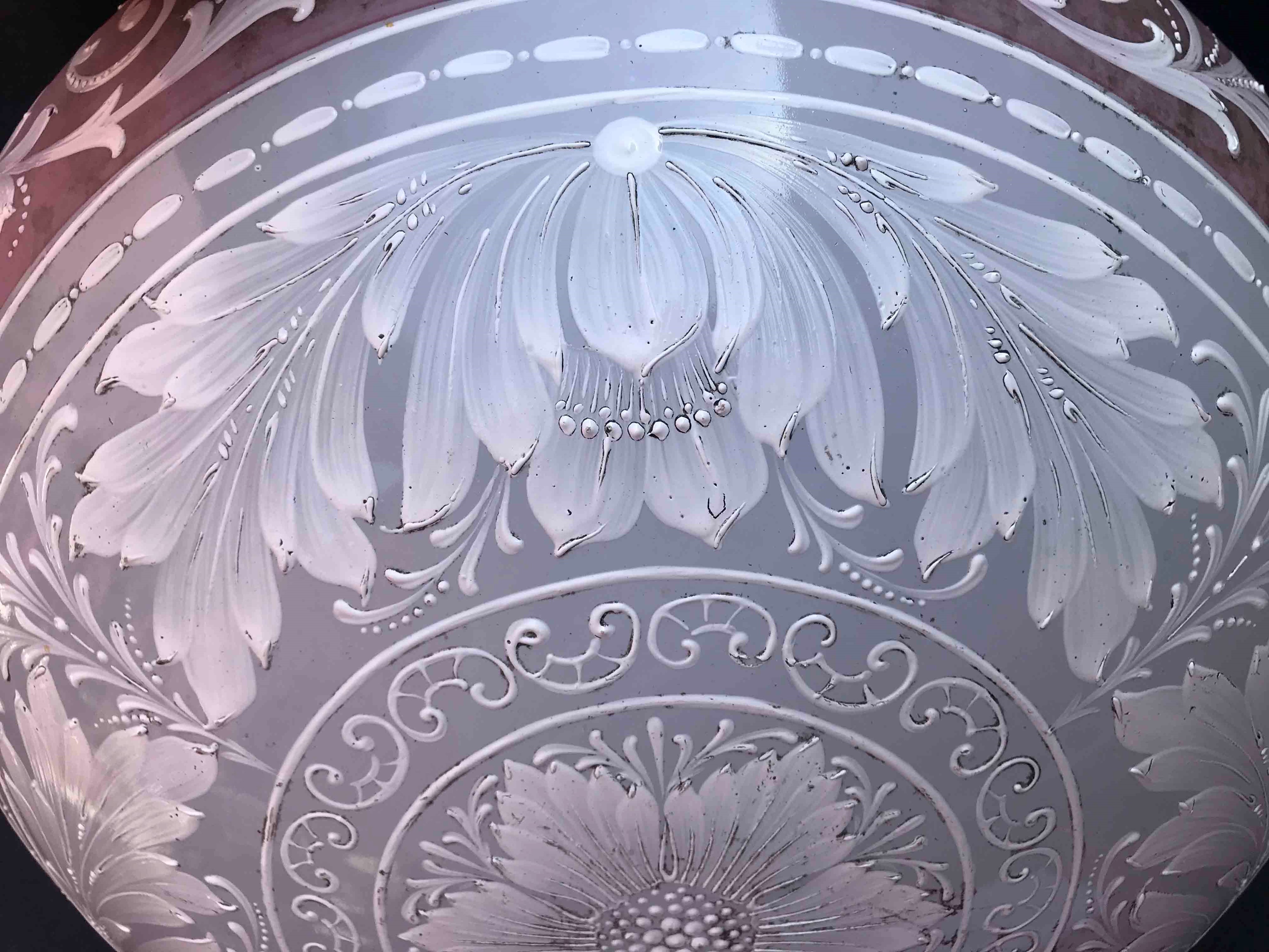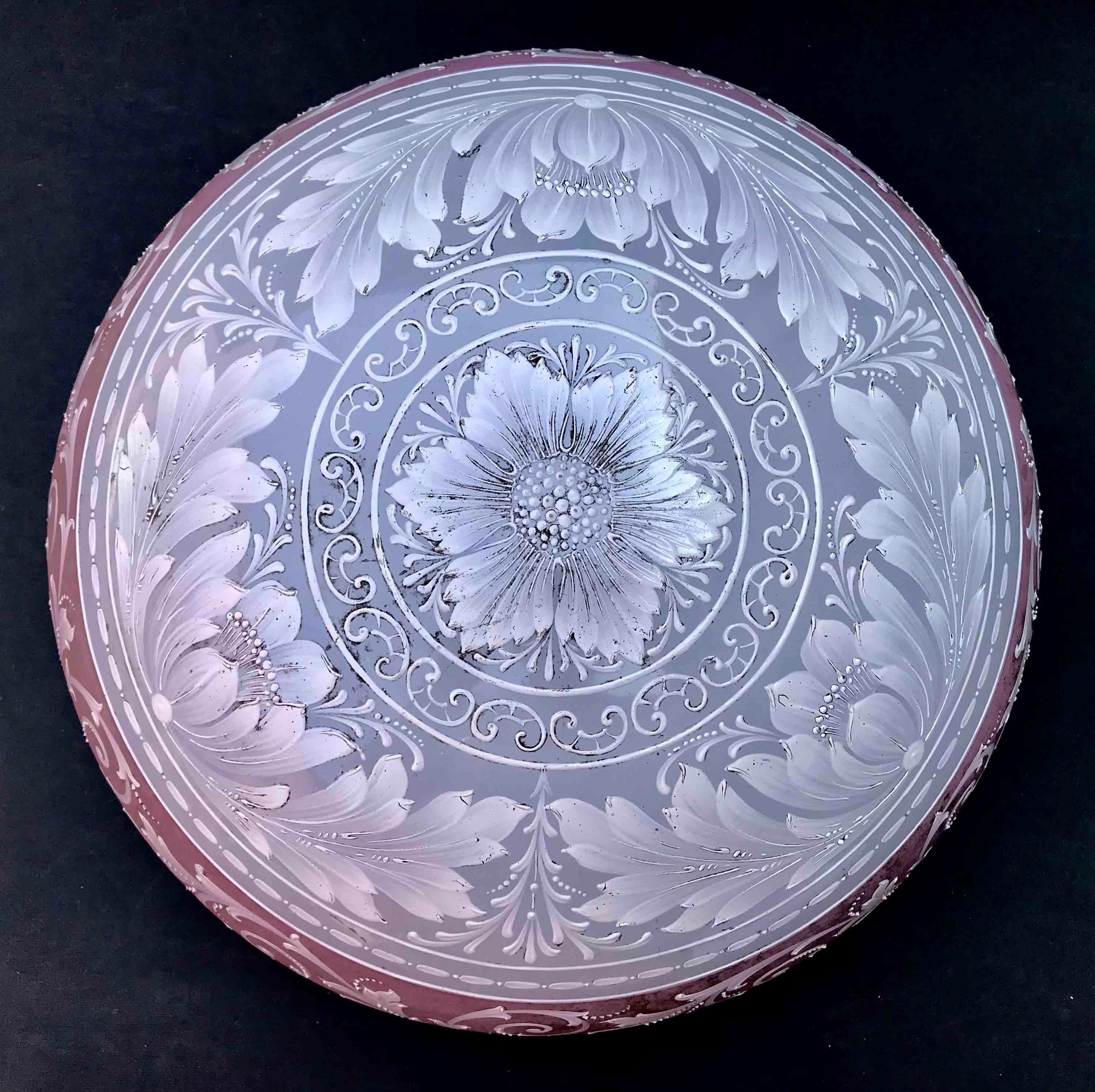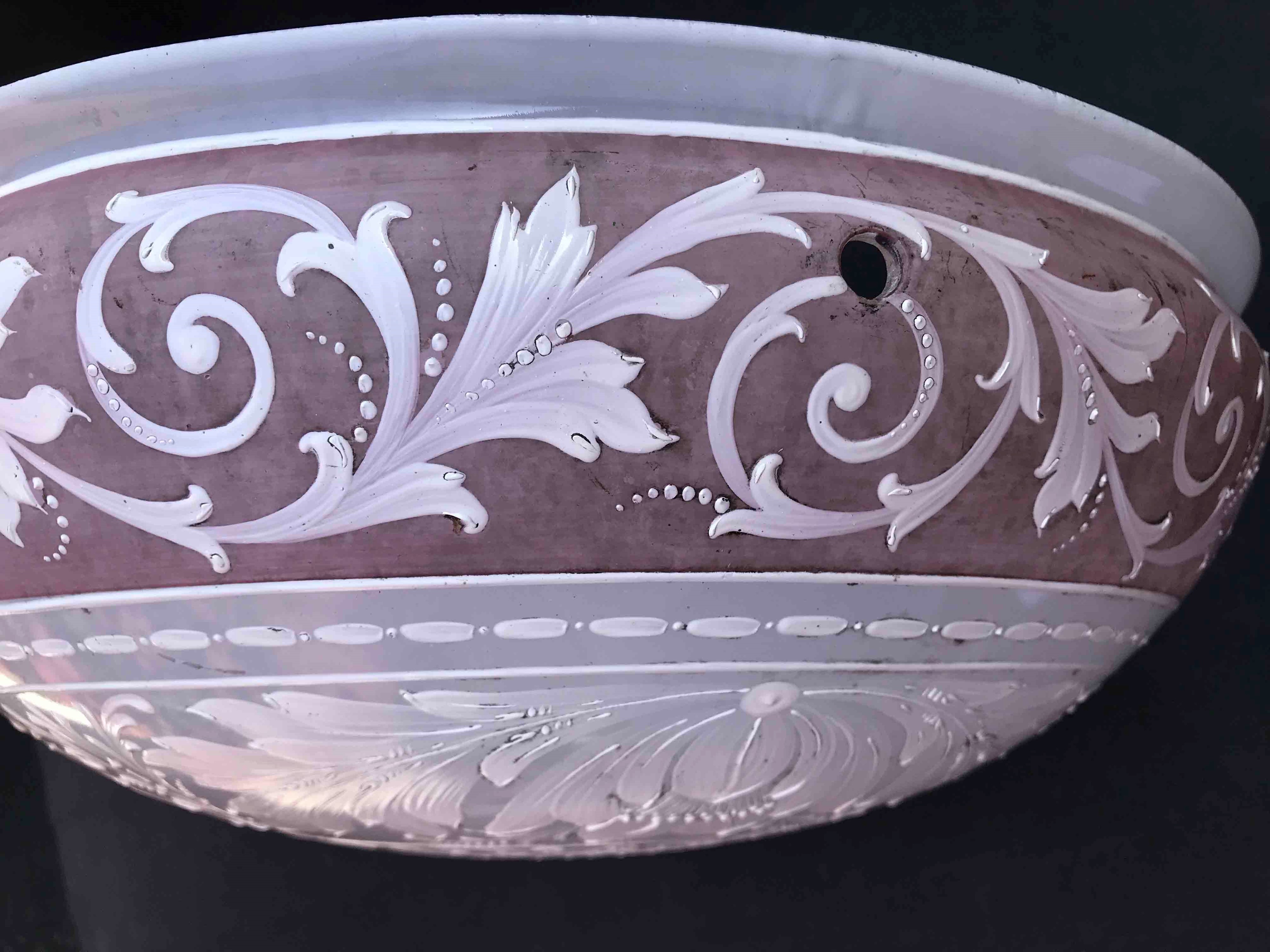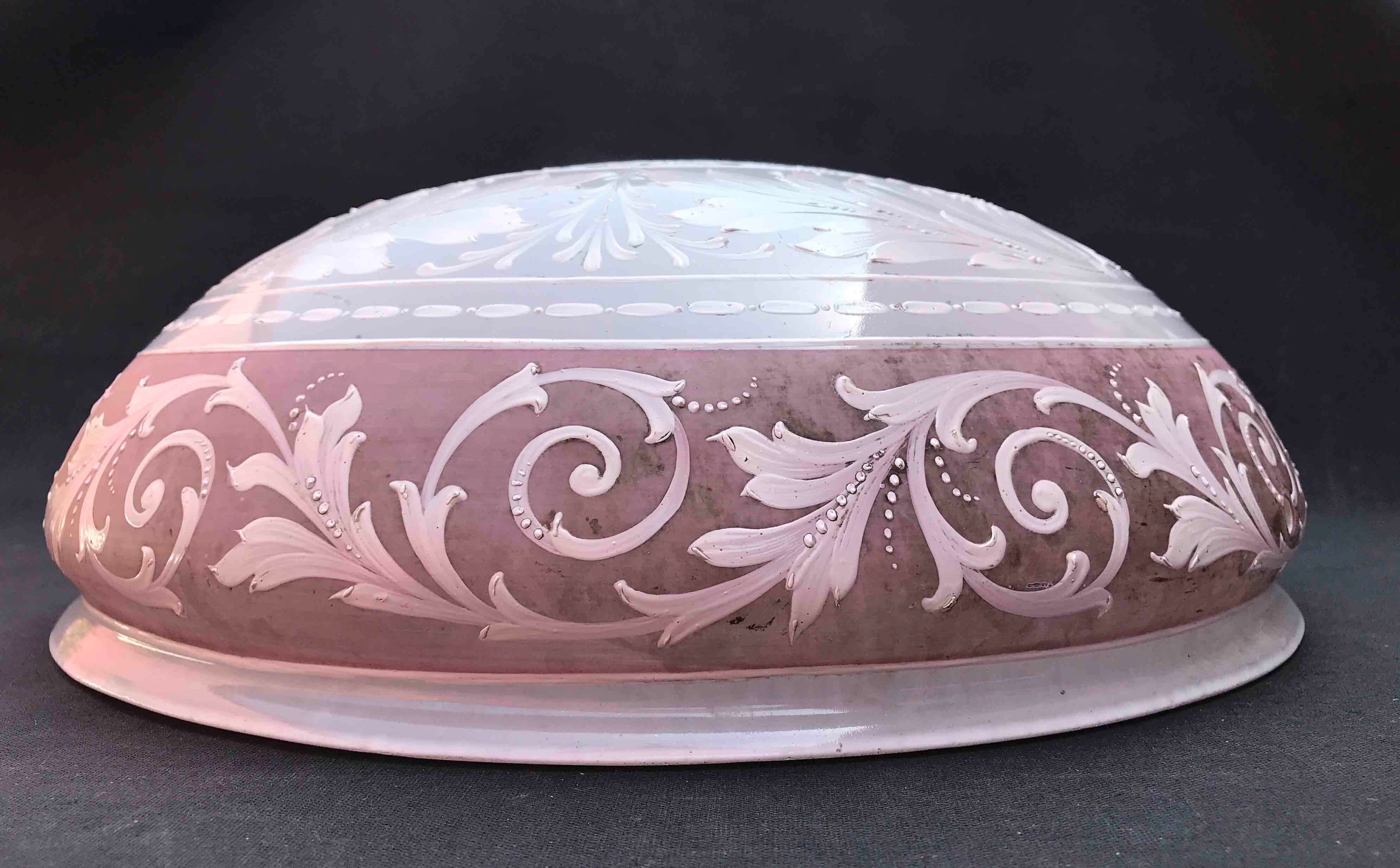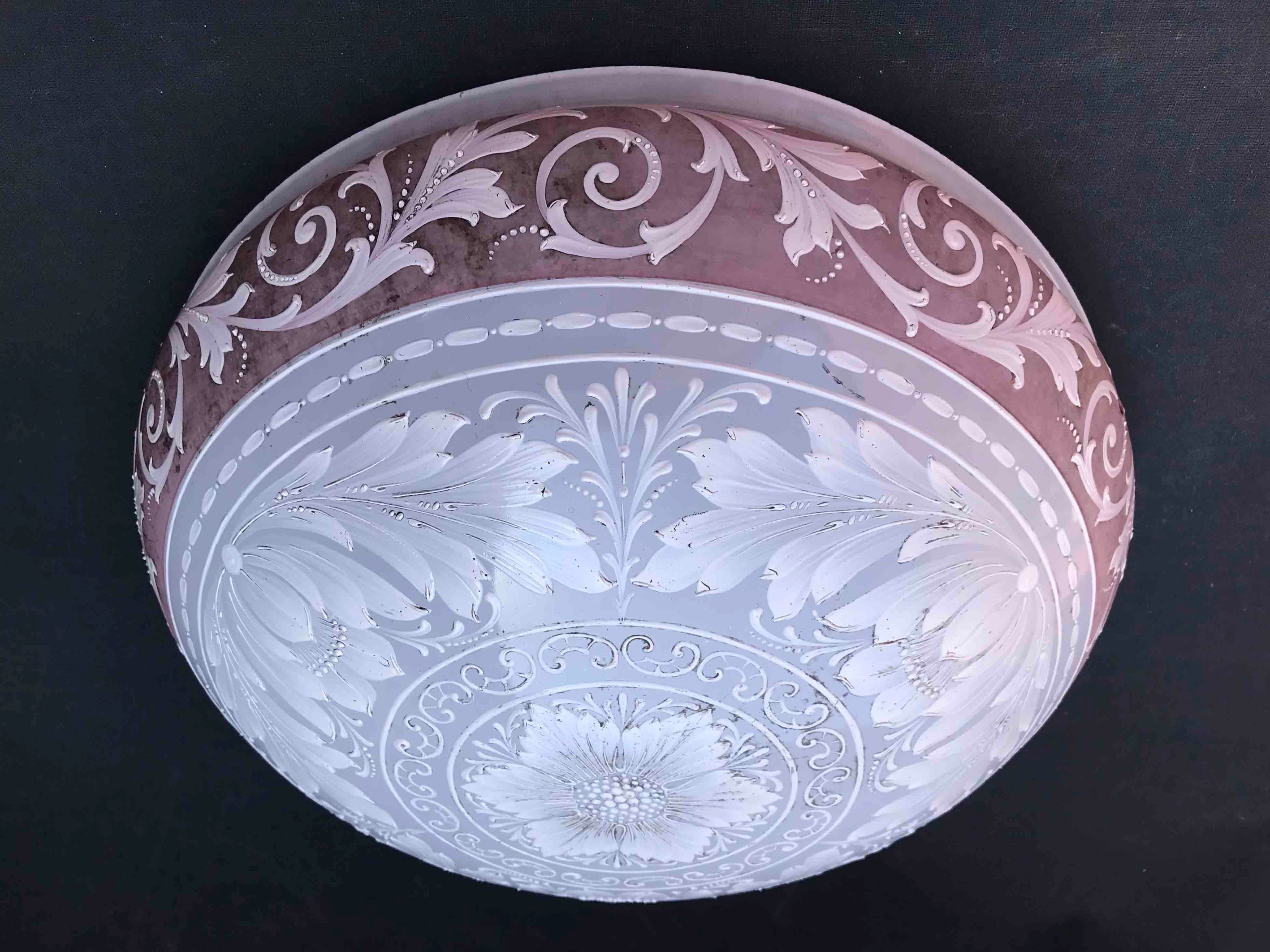 Splendida plafoniera in vetro opalino a rilievo con motivi floreali. XIX-XX seco [..]