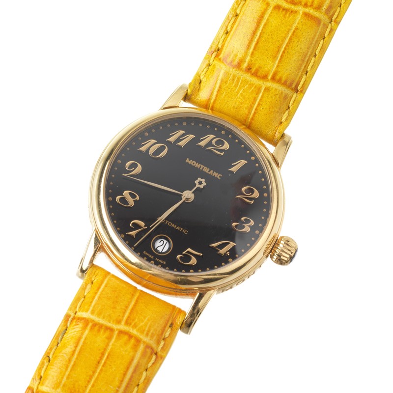 cassa in acciaio dorato, fondello a pressione, corona con emblema a stella bianca, quadrante nero, grafica oro, numeri arabi applicati di colore oro, datario a ore sei con finestra rotonda, movimento a carica automatica, cinturino non originale in pelle di colore giallo, fibbia in acciaio argentato non originale, vetro plastica. Diam. 35