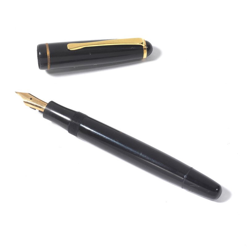 MONTBLANC PENNA STILOGRAFICA NERA "FABRIADO EN ESPANA" fusto in resina di colore nero, dettagli di rifinitura in metallo dorato, cappuccio con emblema a stella dal contorno bianco firmato Montblanc e recante scritta "Fabriado en Espana por E Weise", pennino in oro 14kt, caricamento a pulsante, lungh. cm 13