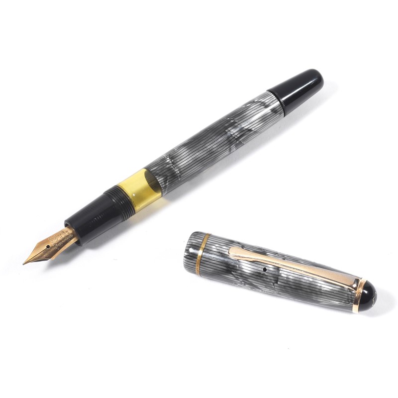 MONTBLANC PENNA STILOGRAFICA NERO/MADREPERLA fusto decorato a linee color nero/madreperla, dettagli di rifinitura in metallo dorato, cappuccio con emblema a stella dal contorno bianco firmato Montblanc e recante scritta "Fabriado en Espana por E Weise", pennino in oro 14kt, caricamento a stantuffo, lungh. cm 13