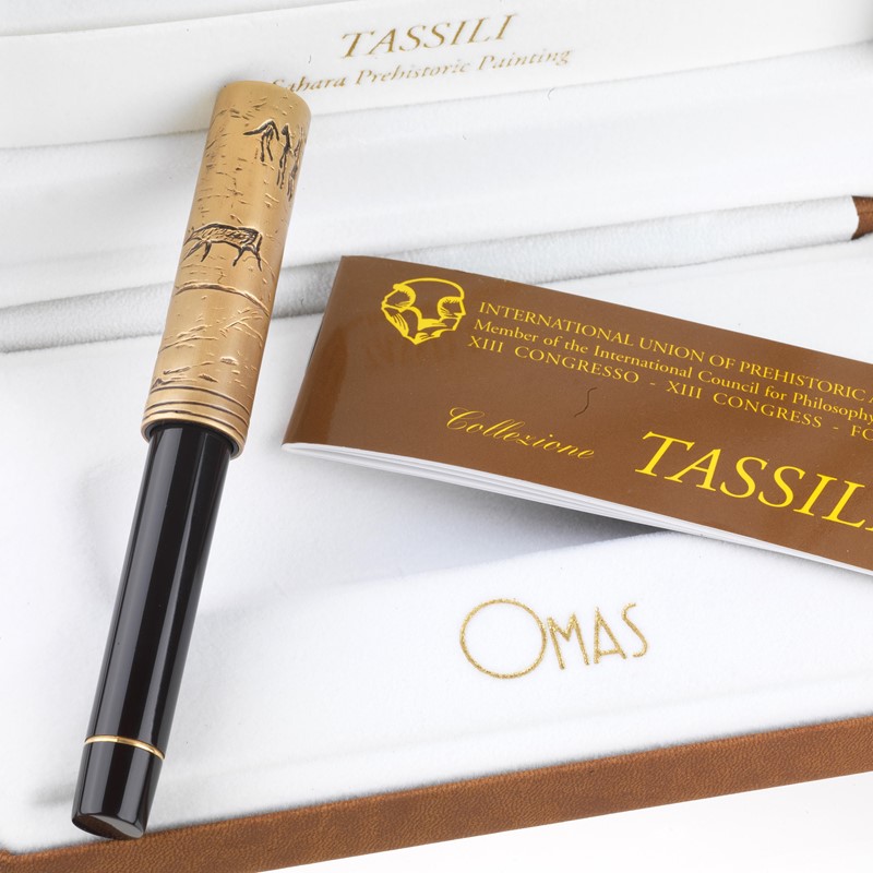 OMAS "TASSILI" PREHISTORIC SAHARA PENNA STILOGRAFICA EDIZIONE LIMITATA N. 916/1500 fusto in resina di colore nero, cappuccio bronzo recante raffigurazioni rupestri preistorici del Sahara, pennino oro 18kt misura F, lungh cm 13,5. Corredata di scatola, controscatola e libretto.