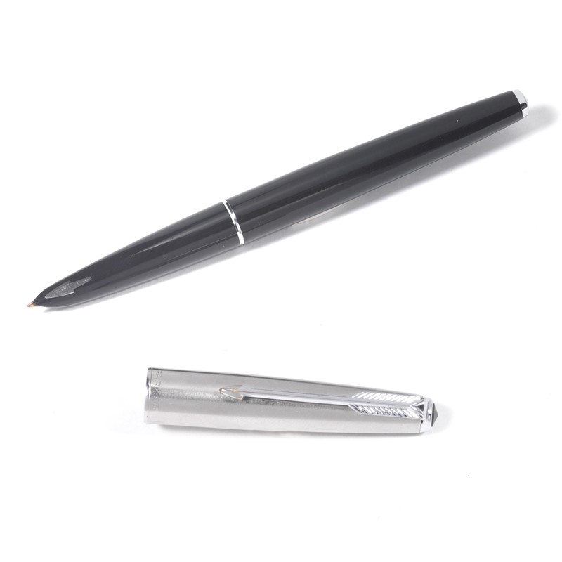 fusto in resina di colore nero, cappuccio liscio e dettagli di finitura in metallo argentato con fermaglio a forma di freccia, firmata Parker, pennino misura media, caricamento a capillarità, lungh. cm 13,5.
