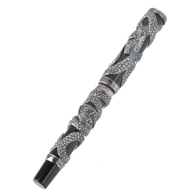 PARKER SNAKE PENNA STILOGRAFICA EDIZIONE LIMITATA N. 0673/5000 ANNO 1997 fusto in resina nera coperto da serpenti incisi e sbalzati in argento sterling dagli occhi impreziositi da luminose pietre di colore verde, punzoni inglesi e 925, pennino in oro 18kt a due colori con inciso un serpente, caricamento a stantuffo, lungh. cm 13,5