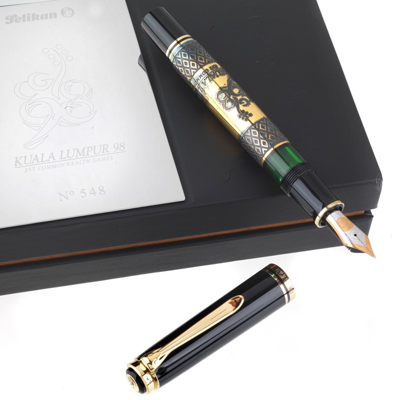 PELIKAN KUALA LUMPUR 1998 - XVI COMMONWEALTH GAMES PENNA STILOGRAFICA EDIZIONE LIMITATA N. 548/888 fusto in resina rivestita da decorazione in argento vermeil con incisione a motivi geometrici e recante scritta “98 Kuala Lumpur”, punzone 925, impugnatura in resina nera, cappuccio in resina nera con emblema di Pelikan e fermaglio a forma di pellicano, pennino oro 18kt misura M, caricamento a stantuffo, lungh. cm 14. Corredata di scatola, controscatola e garanzia. PELIKAN KUALA LUMPUR 1998 - XVI COMMONWEALTH GAMES LIMITED EDITION FOUNTAIN PEN N. 548/888