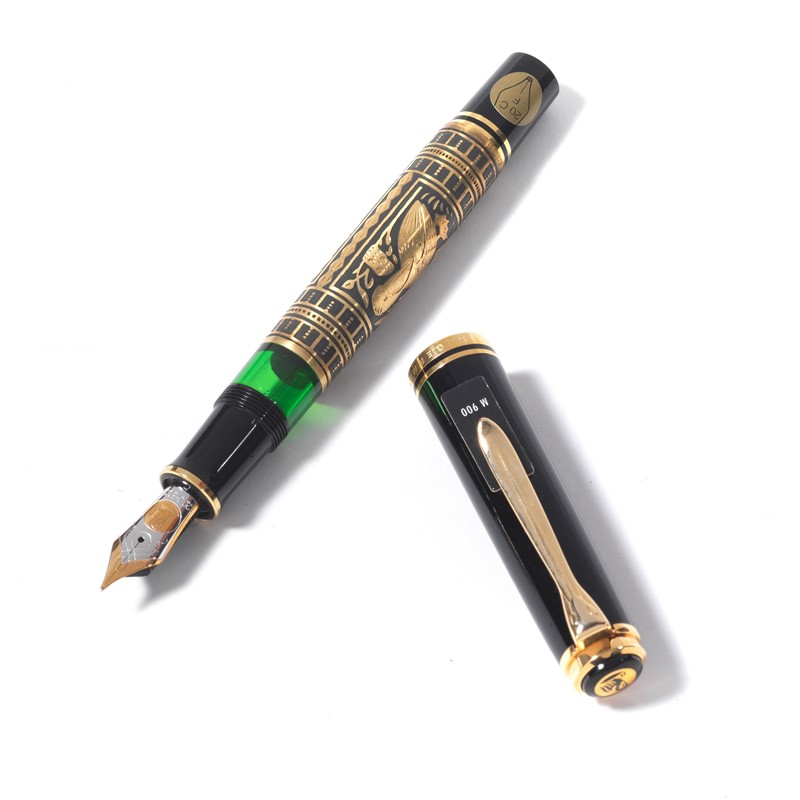 PELIKAN M900 TOLEDO LA/93 PENNA STILOGRAFICA fusto in resina rivestita da decorazione in argento dorato con incisione di pellicani simbolo del brand e a motivo geometrico e fogliaceo, punzone 925, impugnatura in resina nera, cappuccio con emblema di Pelikan e fermaglio a forma di pellicano, pennino oro 20kt misura F, caricamento a stantuffo, lungh. cm 14.