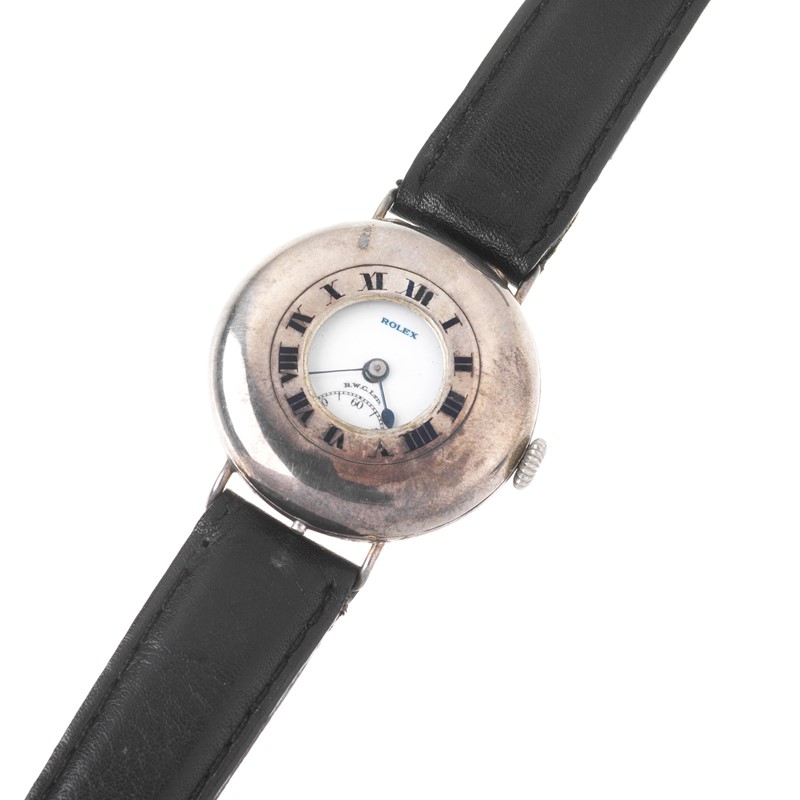 cassa in argento sterling, punzone 925, fondello serrato a vite, coperchio a cerniera con lunetta in argento con numeri romani a smalto blu, quadrante in porcella recante scritta Rolex e R.W.C. LTD. numeri arabi a smalto, dodici in rosso, secondi a ore sei, movimento a carica manuale, cinturino in pelle nera e fibbia in metallo non originali, vetro plastica, gr. complessivi 43. Diam. mm 35