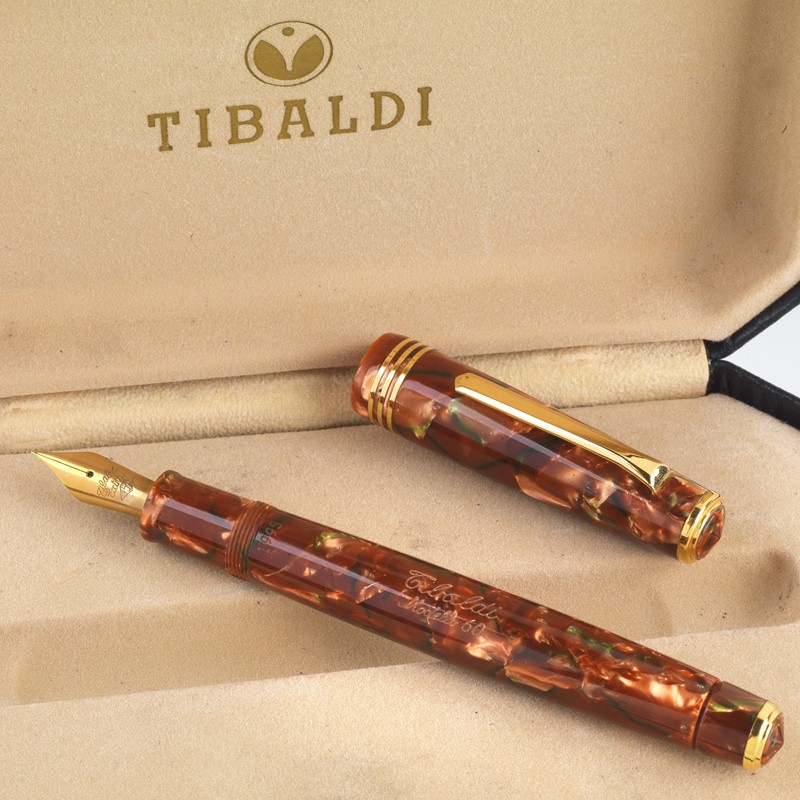 TIBALDI MODELLO 60 PENNA STILOGRAFICA ANNO 1995 fusto in celluloide di colore rosso/verde effetto marmorizzato, dettagli di rifinitura in metallo dorato, pennino oro 18kt misura EF, caricamento a stantuffo, lungh. cm 14,5. Corredata di scatola, controscatola e libretti. TIBALDI MODELLO 60 RED/GREEN MARBLED FOUNTAIN PEN, 1995