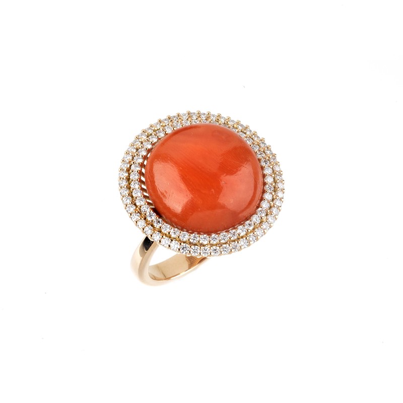 in oro giallo 18kt, al centro un bottone in corallo di mm 16x9 circa, circondato da una doppia fila di diamanti taglio brillante per ct 0.80 circa, punzone 750, mis. 55, gr. 12