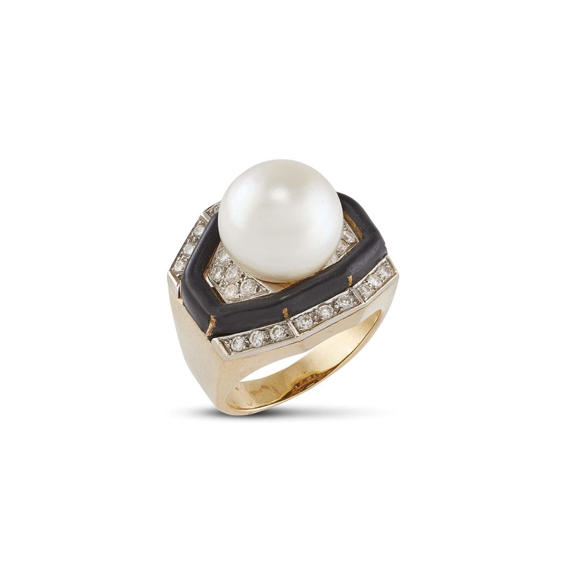 in oro giallo e bianco 18kt, con decorazione in smalto nero, al centro una perla coltivata di mm 13 circa, impreziosito da pavé di diamanti taglio brillante per ct 0.80 circa, mis. 61, gr. 20