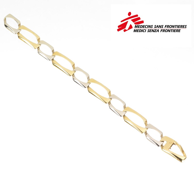 BRACCIALE A CATENA in oro giallo e bianco 18kt, punzoni 750 e del fabbricante, lungh. cm 18,5, gr. 32