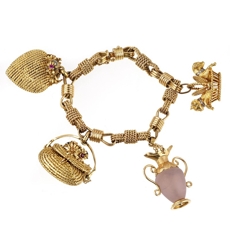 BRACCIALE A CATENA CON CHARMS in oro giallo 18kt, composto da un serie di maglie realizzate a cordicella da cui pendono dei ciondoli raffiguranti un cuore, una borsetta, un'anfora e un cestino con cane e gatto, punzoni 750 e del fabbricante, lungh. cm 17,5, gr. 125