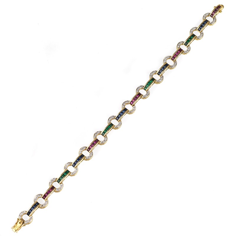 BRACCIALE A CATENA CON PIETRE DI COLORE E DIAMANTI in oro giallo 18kt, composto da una serie di dischi con diamanti taglio brillante per ct 0.80 circa e distanziali impreziositi da zaffiri, rubini e smeraldi taglio carré per ct 0.60 circa, punzone 750, lungh. cm 18,5, gr. 17