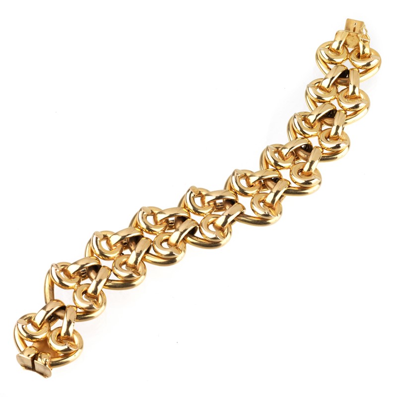 in oro giallo 18kt, realizzato ad ampia fascia con una serie di maglie concatenate, punzoni del fascio, lungh. cm 21,5, gr. 85
