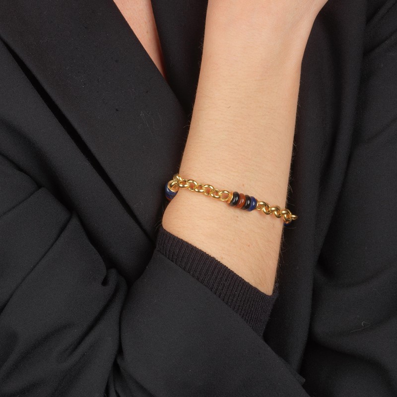 BRACCIALE CON CATENA ROLLO E PIETRE SEMIPREZIOSE in oro giallo e bianco 18kt, composto da una serie di maglie circolari intrecciate alternate a dischi in pietre semipreziose come distanziali, punzoni 750 e del fabbricante, chiusura a moschettone, lungh. cm 19,5, gr. 16