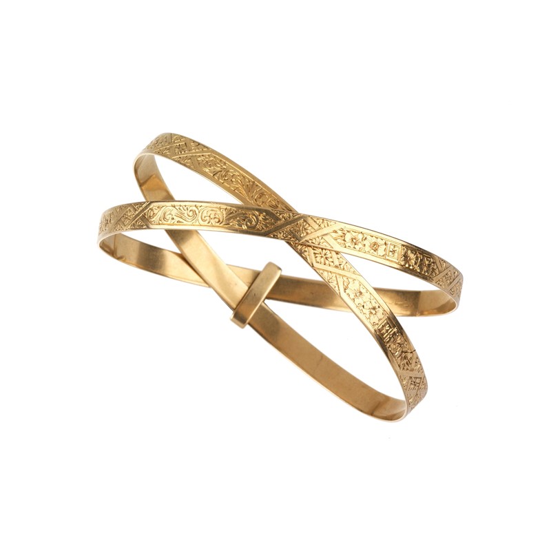 in oro giallo 18kt, composto da due bracciali a cerchio con fregi decorativi incisi raffiguranti tralci e motivi geometrici, uniti da un elemento di giunzione, diam. cm 6,5 circa, gr. 22