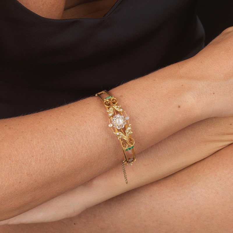 BRACCIALE RIGIDO CON PIETRE SINTETICHE E MICROPERLE in oro a basso titolo, sulla sommità un motivo floreale impreziosito da elementi in madreperla, pietre sintetiche bianche e verdi e microperle, dim. cm 6,5x6, diam. cm 6, gr. 10