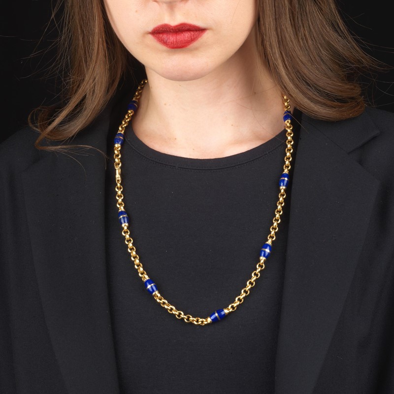 COLLANA A CATENA ROLLO CON LAPISLAZZULI in oro giallo 18kt, composta da distanziali con barilotti in lapislazzuli, scomponibile in bracciale e girocollo, punzoni 750 e del fabbricante, lungh. collana cm 63, lungh. bracciale cm 18, gr. 47