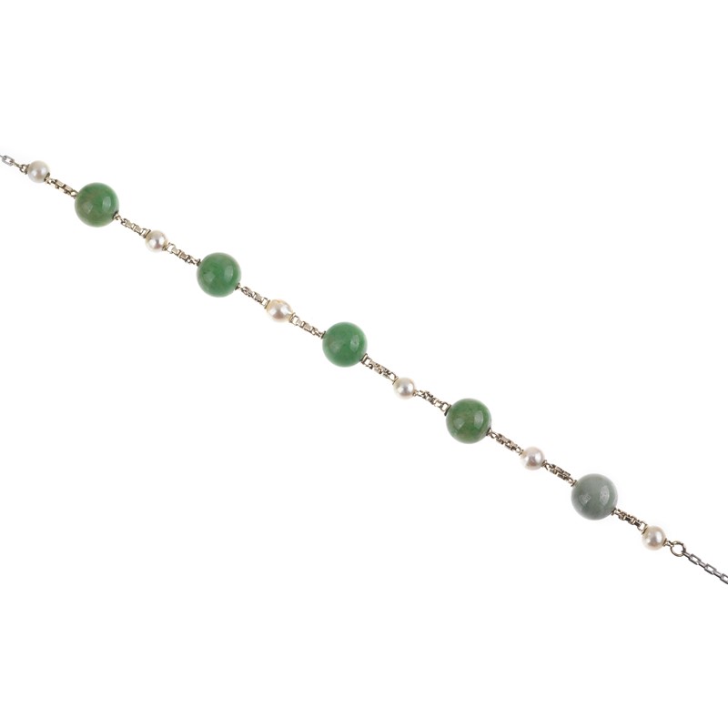 COLLANA CON PERLE E PIETRE DURE in oro bianco 18kt, composta da una serie di sfere in pietra dura di mm 11 circa alternate a perle di mm 6 circa, punzoni 750 e del fabbricante, lungh. cm 41,5, gr. 19