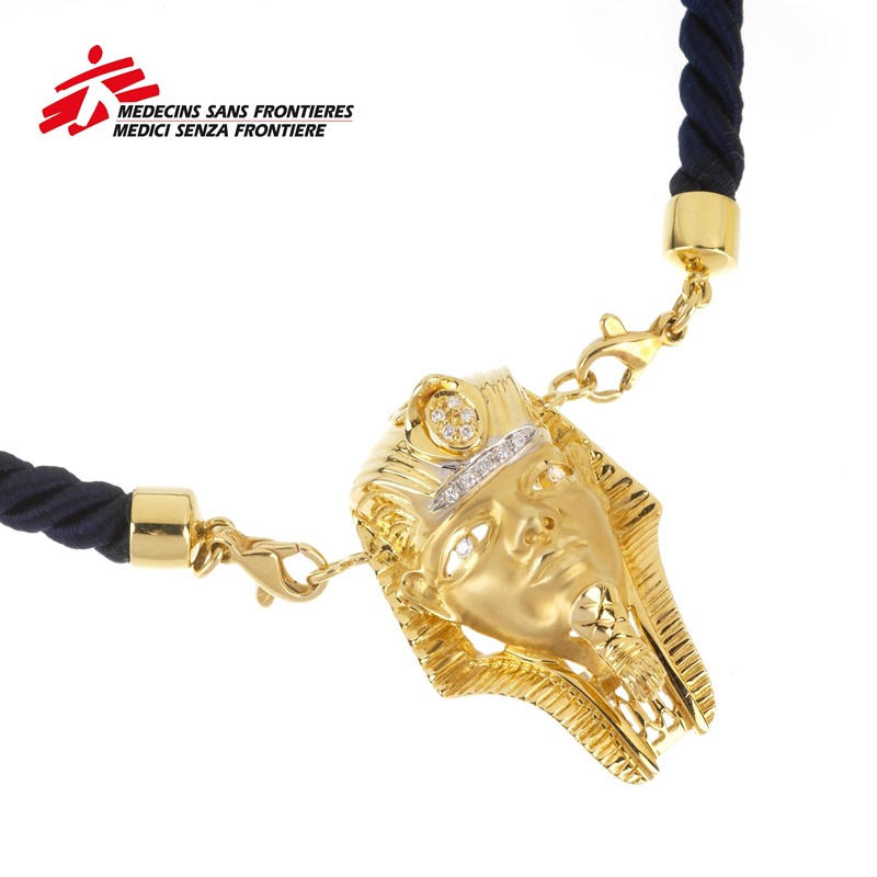composta da una corda in tessuto, da cui pende un ciondolo convertibile in spilla a forma di mascherara funeraria egizia, impreziosita da diamanti taglio brillante per ct 0.10 circa, punzoni 750 e del fabbricante, lungh. cm 38, dim. pendente cm 2,5x3,5, gr. pendente 16, gr. 22 complessivi
