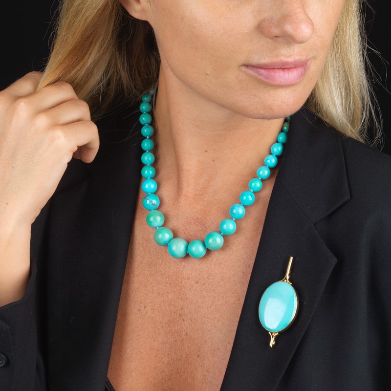 una collana ad un filo di sfere in turchese digradanti di mm 15-7 circa, fermatura in oro bianco 18kt impreziosita da diamanti taglio huit huit per ct 0.10 circa, punzone 750, lungh. cm 47, accompagnata da una spilla in pasta di turchese taglio cabochon, montatura in oro giallo 18kt, punzoni 750 e del fabbricante, dim. cm 3x7,5, gr. 93 complessivi