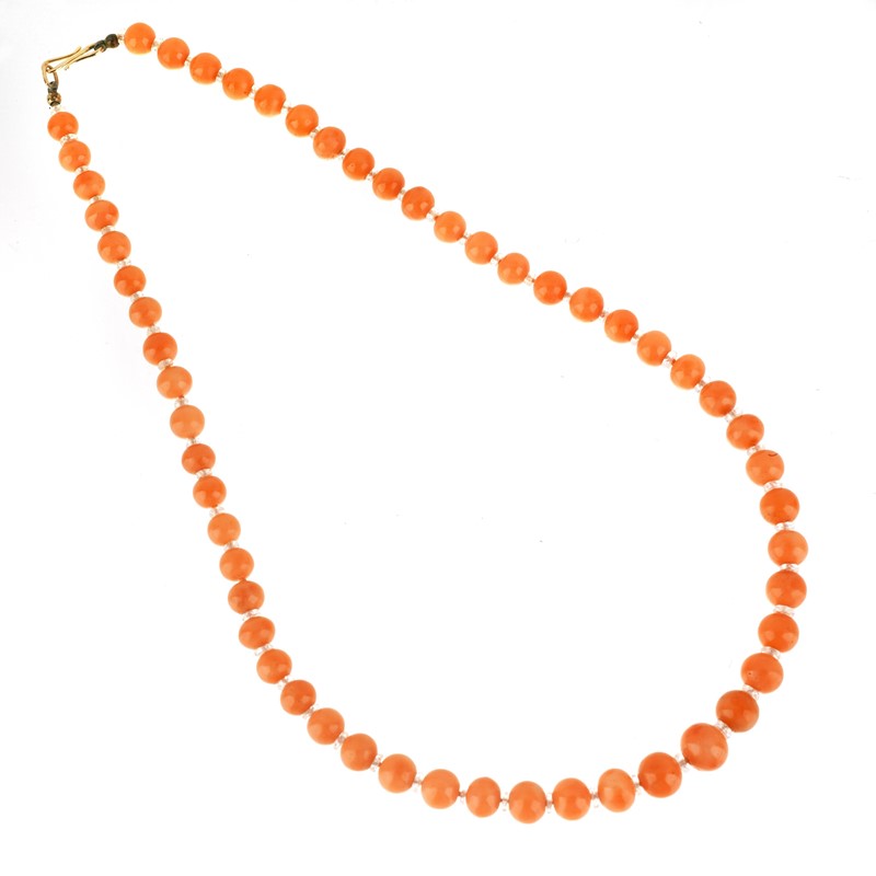 composta da una serie di sfere in corallo leggermente digradanti di mm 10-7 circa, alternate a piccoli elementi a disco in cristallo di rocca, fermatura in oro 9kt, lungh. cm 47, gr. 34
