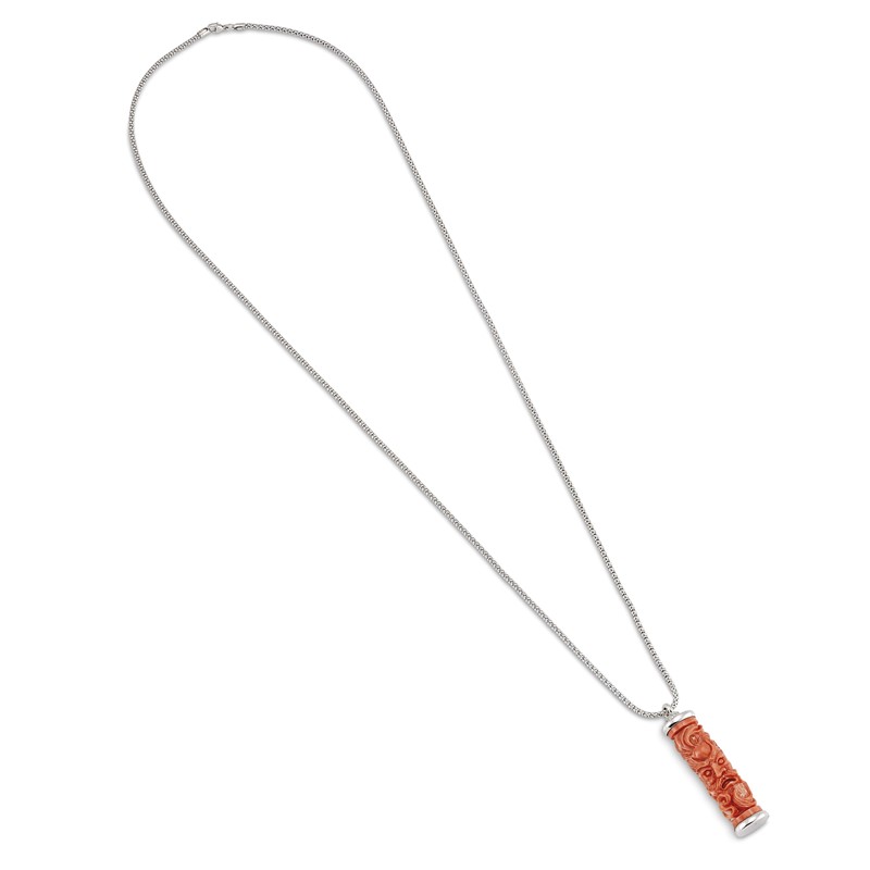 COLLANA TUBOLARE CON PENDENTE IN CORALLO INCISO in oro bianco 18kt, ciondolo pendente in corallo a forma di cilindro con motivo orientale inciso, punzoni 750 e del fabbricante, lungh. cm 78, gr. 28