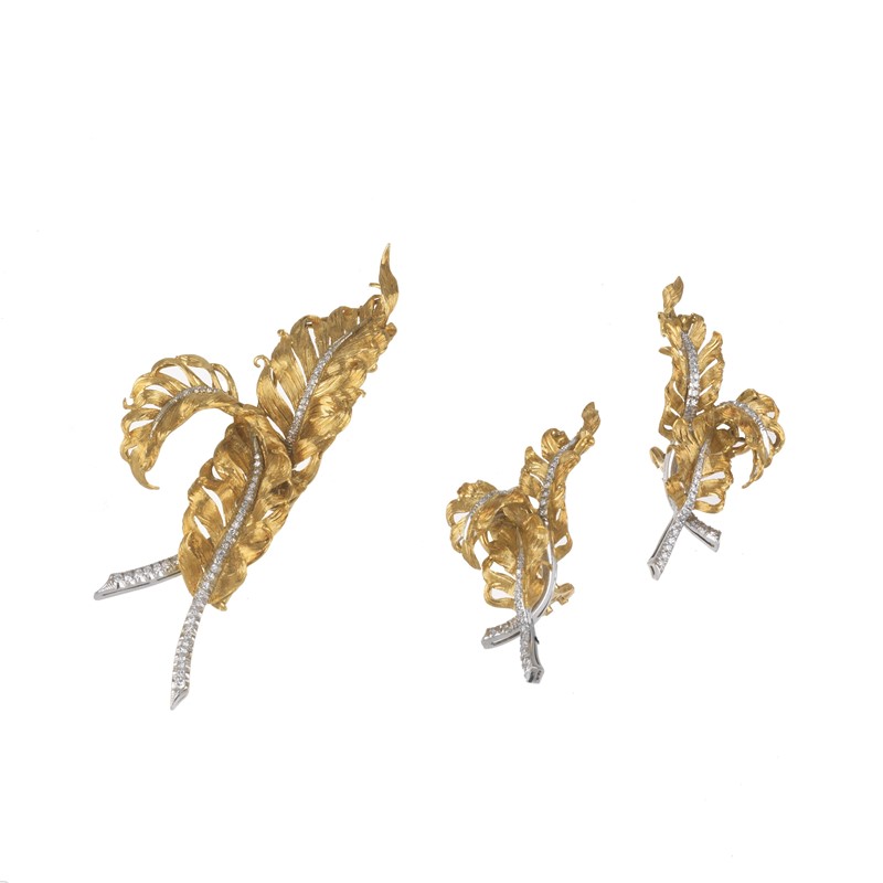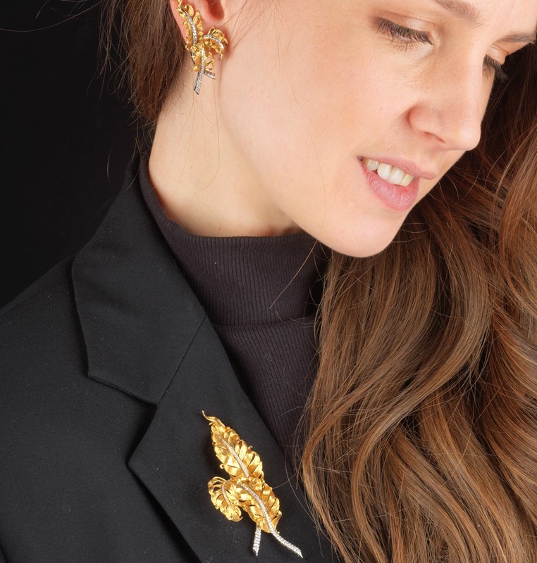DEMI PARURE A FORMA DI FOGLIE CON DIAMANTI in oro giallo e bianco satinato 18kt, composta da spilla e paio di orecchini a doppia foglia impreziositi da diamanti taglio huit huit per ct 0.60 circa (uno mancante), punzoni 750 e del fabbricante, dim. spilla cm 3x8 circa, dim. orecchini cm 4x3 circa, chiusura a clip, gr. 34 complessivi