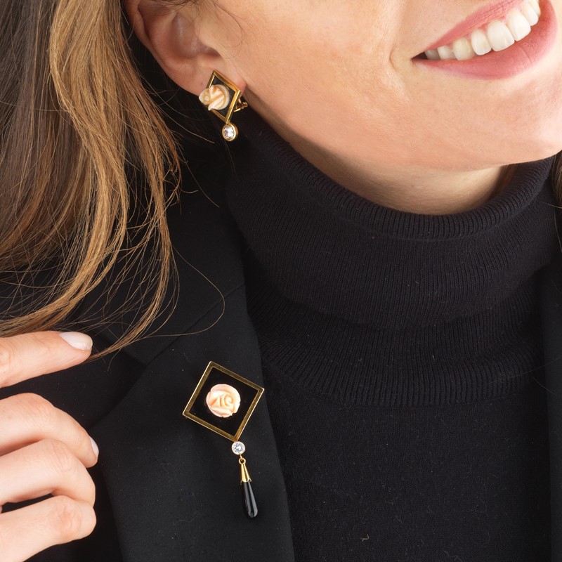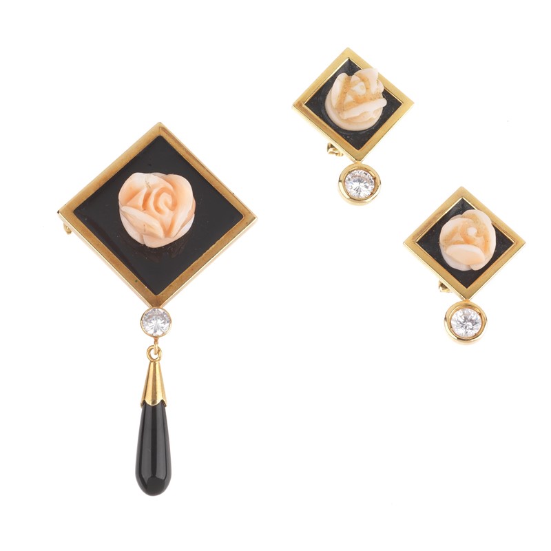 in oro giallo 18kt e onice, composta da spilla e paio di orecchini recanti al centro delle rose incise in corallo e impreziositi da pietre sintetiche incolore, punzone 750, chiusura orecchini a clip con perno, gr. 27 complessivi